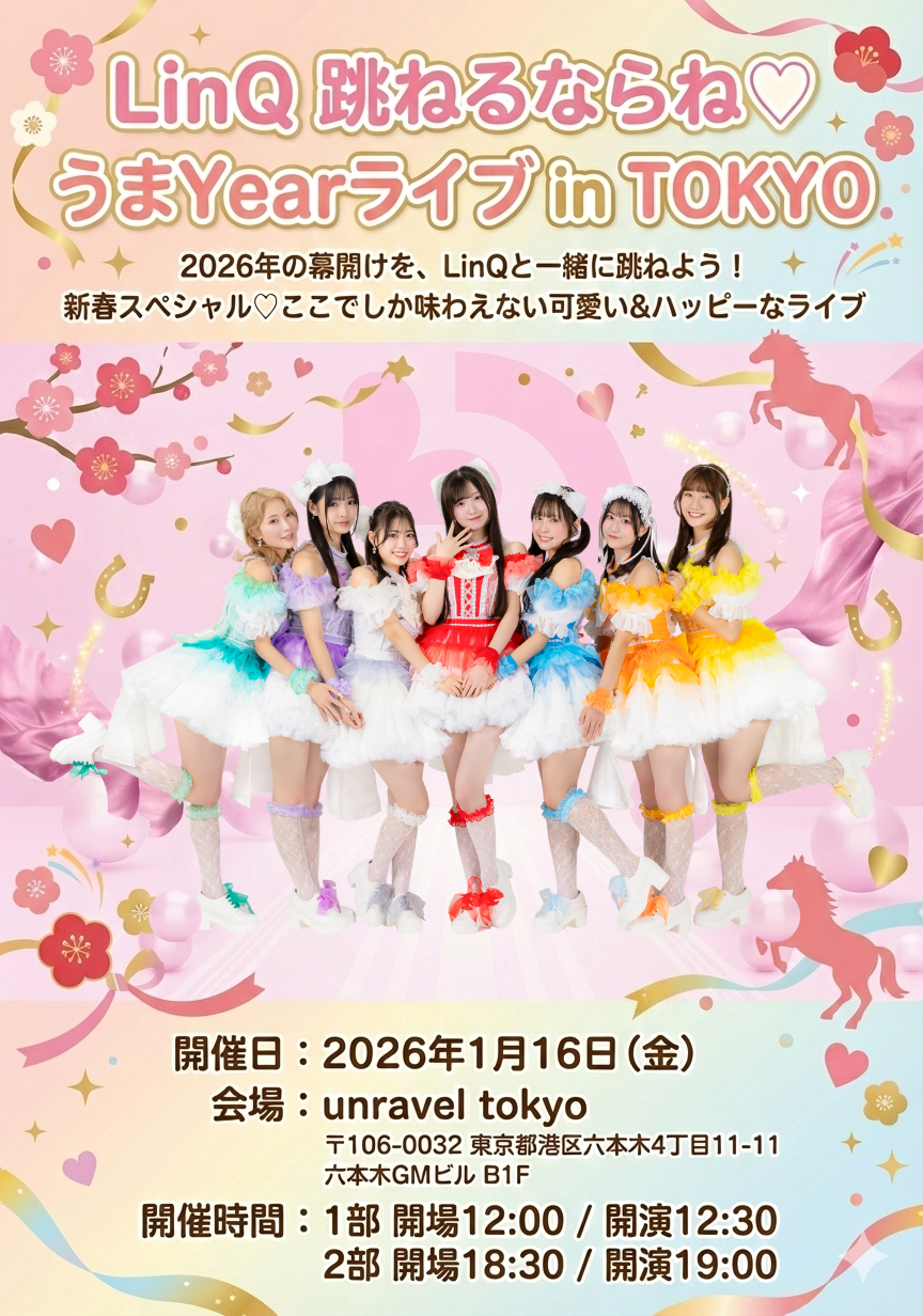 ✨新春スペシャルイベント「LinQ 跳ねるならね♡うまYearライブ」inTOKYOを開催いたします!恋するようにときめく「ならね」の余韻と、午年らしい“跳ねる・駆ける”エネルギーを楽しく重ねた、ここでしか味わえない可愛い&ハッピーな新春ライブです🐎